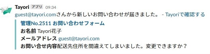 Tayori経由の問い合わせ受信を知らせるSlackの通知ポスト。