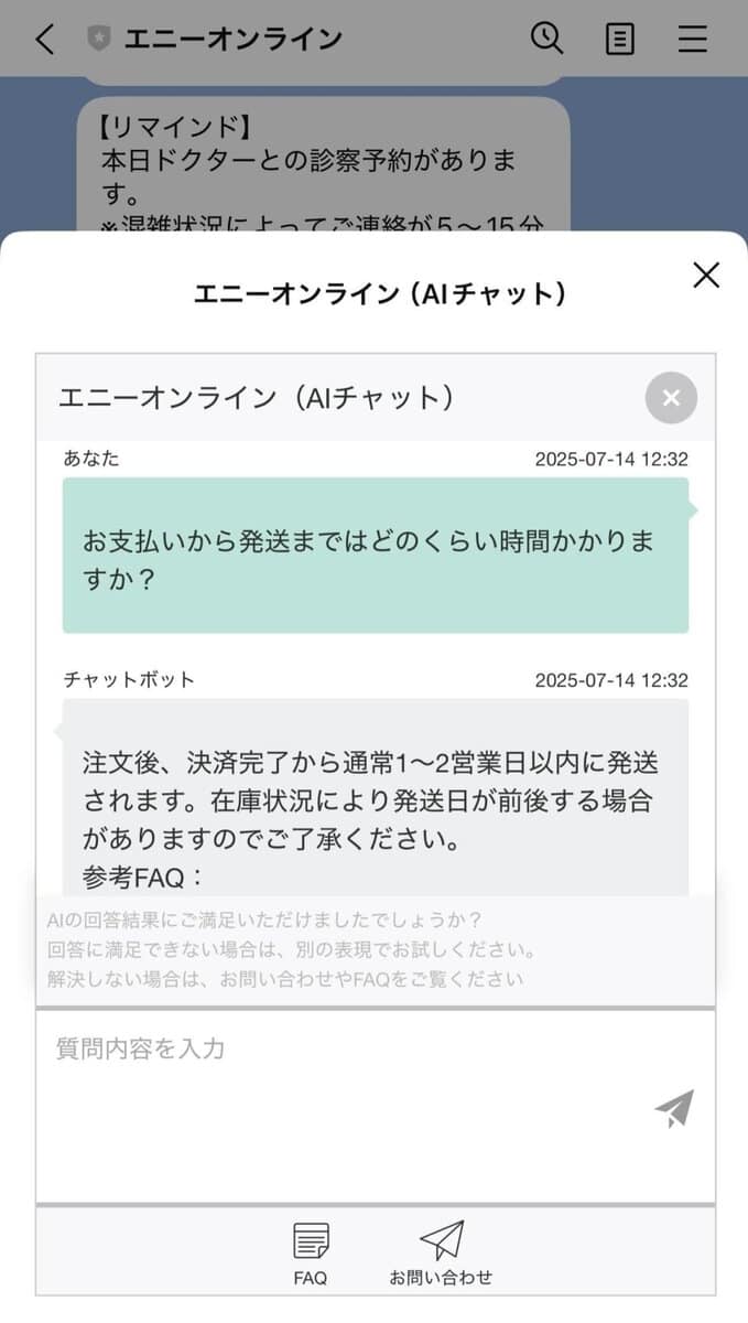 問い合わせの内容はある程度パターン化されているので、いかに効率よく“アンサー”を届けられるかが鍵になります。例えば、「薬はいつ届きますか?」といった配送に関する問い合わせが多く、こういった内容には定型的に答えられるので、FAQをしっかり載せておくことが重要です。