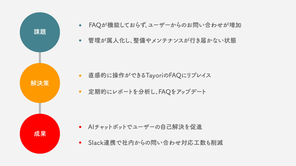 簡単な内容でもお問い合わせが集中してしまうと、どうしてもサポートチームの対応工数が増大してしまいます。FAQを見てくだされば5分とかからない内容であっても、FAQがわかりづらかったり、そこで解決できなかったり、そもそもFAQを見る習慣がなかったりでお問い合わせが増えてしまっていたので、ユーザーが自己解決できる体制にしたいというのがありました。