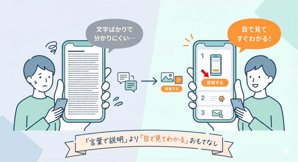「言葉で説明する」のではなく、「目で見てわかる」ようにすること。これも大切なおもてなしです。どのボタンを押せばいいか一目でわかる画像を添えることで、操作への不安を取り除きます。