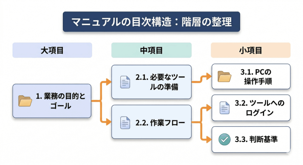 見やすいマニュアルを作るレイアウトのポイント1つ目は、時系列が大項目から小項目へと順に整理されていることです。