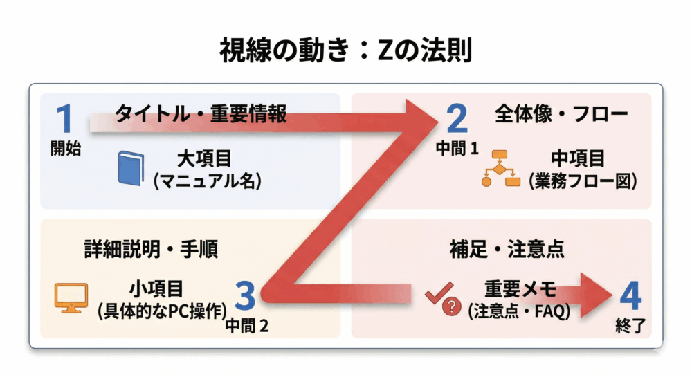 人の視線の動きには法則があり、そのひとつが「Zの法則」です。資料が横書きの場合によく見られる動きで、左上→右上→左下→右下の順番に視線が移動します。レイアウトに迷ったら、Zの流れを意識してマニュアルを作成してみてください。