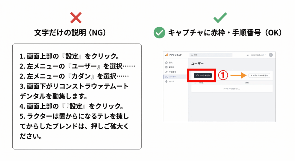 マニュアルの内容によって、テキスト以外に写真やイラスト、図などを挿入すると利用しやすさが向上します。特にツールの操作説明が記載されている場合、キャプチャーの有無は非常に重要。テキストがどこを示しているのか、挿入した写真やイラストには印を付けるのもおすすめです。