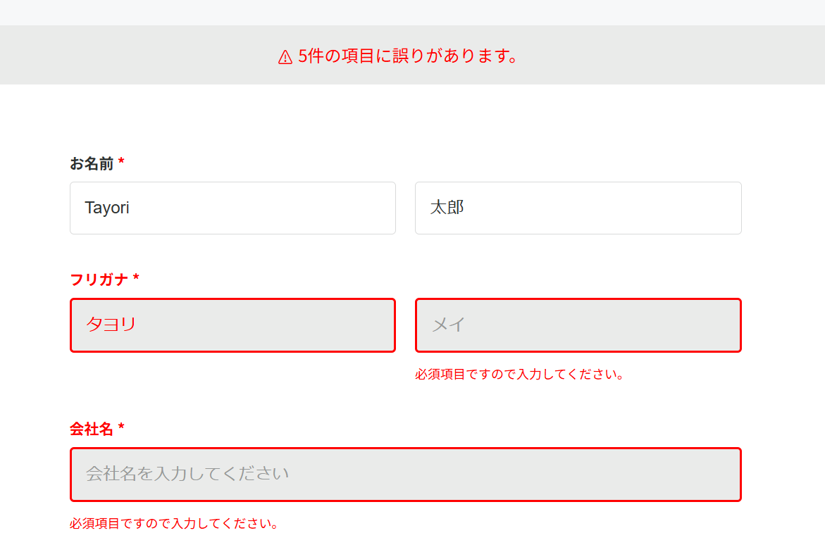 入力形式が違う場合や必須項目が空欄の場合など、エラーが発生した際はリアルタイムでわかりやすく通知するのが理想です。エラー箇所を強調色で囲む、エラーメッセージを具体的に表示するなど、ユーザーが素早く修正できる仕組みを用意しましょう。