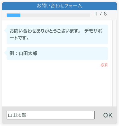 チャット形式で1問ずつ質問に答えていくタイプのフォーム。会話の流れで必要事項を聞き出すため、堅苦しさがなく、入力負担を感じにくいという特徴があります。