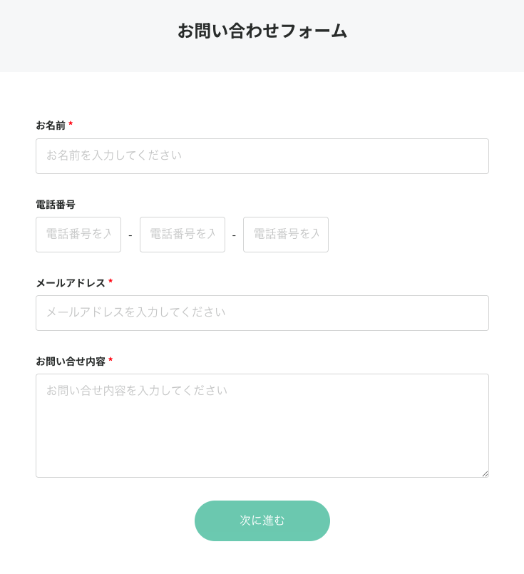 入力項目が少ない場合、フォームを1画面に収め、余計なスクロールが発生しないように設計。ユーザーが一目で完了までのボリュームを把握できるため、離脱率を下げられます。