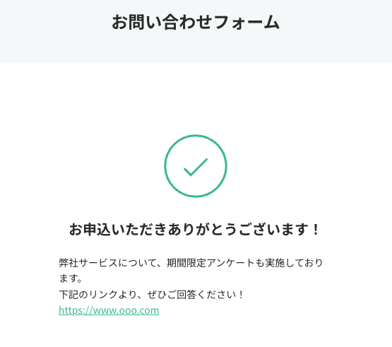 送信直後にアンケートや追加オファーの表示ができるフォーム。問い合わせ内容を確認したタイミングで関連する提案を行えるため、顧客満足度やアップセルの可能性を高めます。