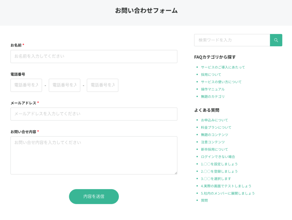 FAQとフォームを同一ページにまとめたデザイン。ユーザーが疑問を解決しながら問い合わせを行えるため、二度手間を防ぎ、満足度向上にも寄与します。