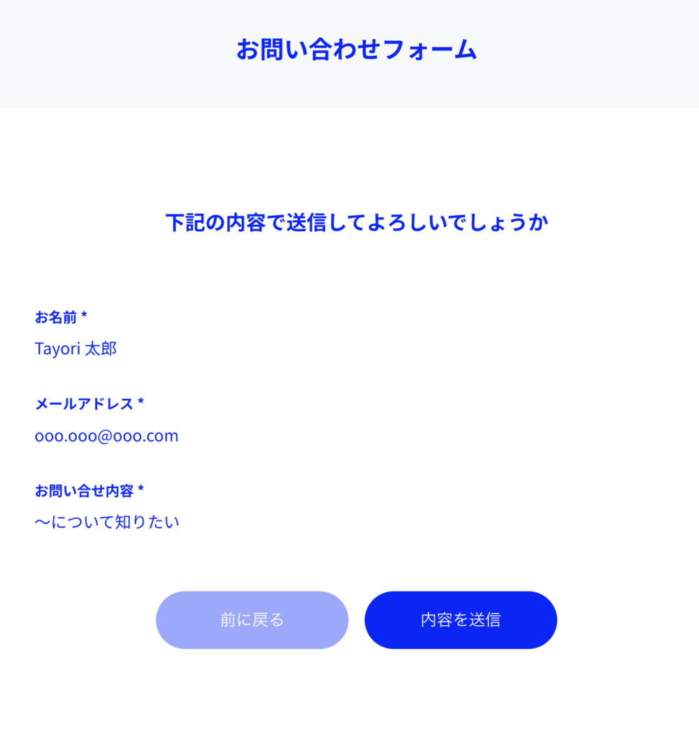 フォーム送信ボタンの上に、再度入力内容を確認できるサマリーを表示。誤りがあればすぐに修正できるため、送信後のエラーや再入力を最小限に抑える効果があります。