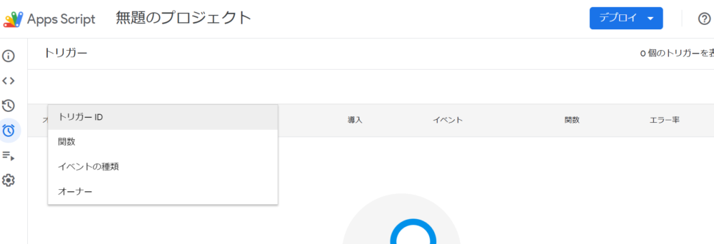 - スクリプトエディタの画面左側にある「時計アイコン」(トリガー)をクリックします。