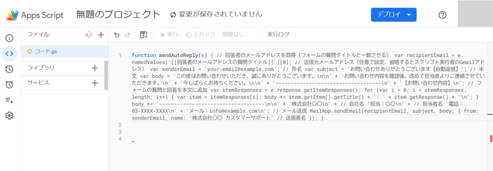 スクリプトエディタが開いたら、自動返信メールを送信するためのコードを記述します。
