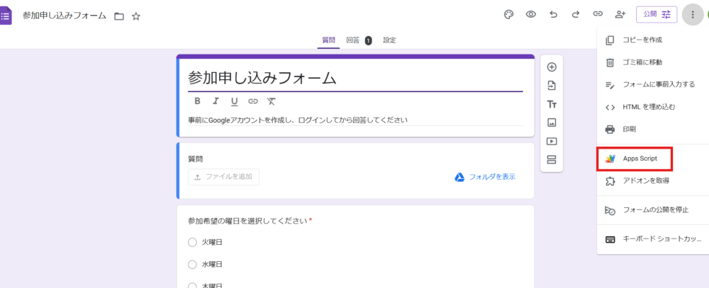 自動返信メール設定を行いたいフォームを開いたら、画面の右上にある「その他」を開き、「アドオン」をクリックします。