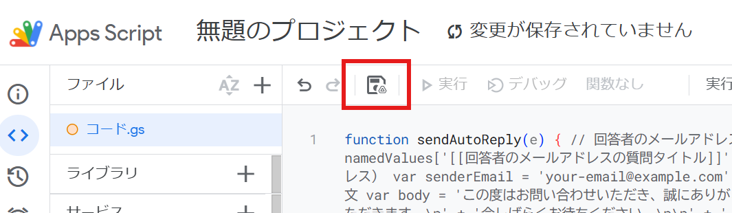 - コードを保存します。スクリプトエディタ上部のフロッピーディスクアイコン(保存)をクリックするか、