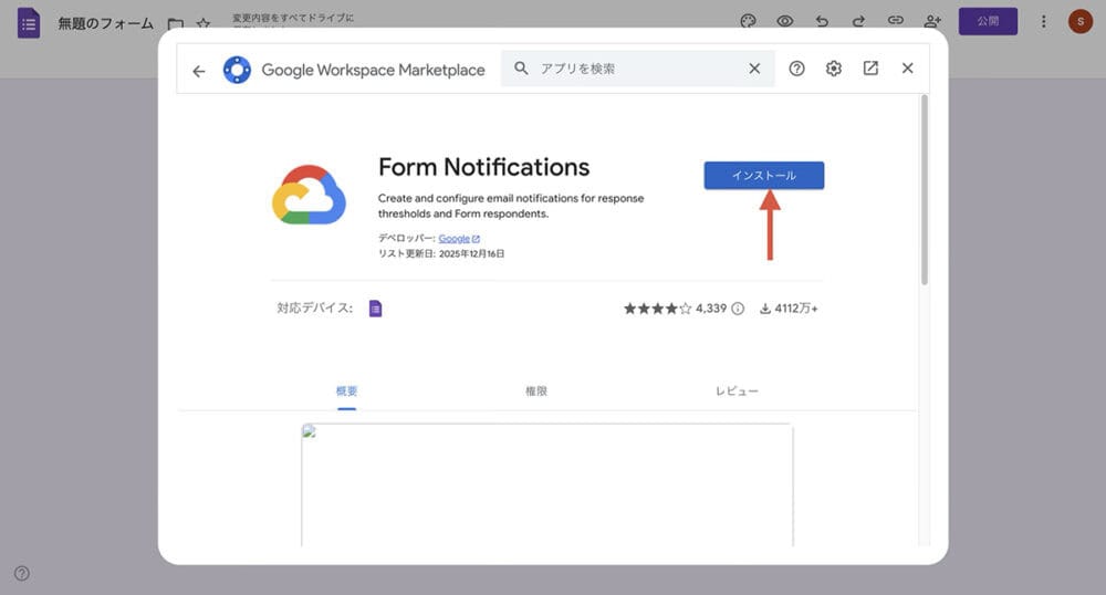 Google Workspace Marketplaceで「Form Notifications」を検索し、インストールします。