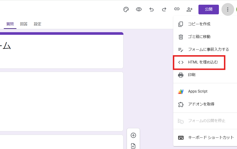 まず、埋め込みたいGoogleフォームの埋め込み用HTMLコードを取得します。