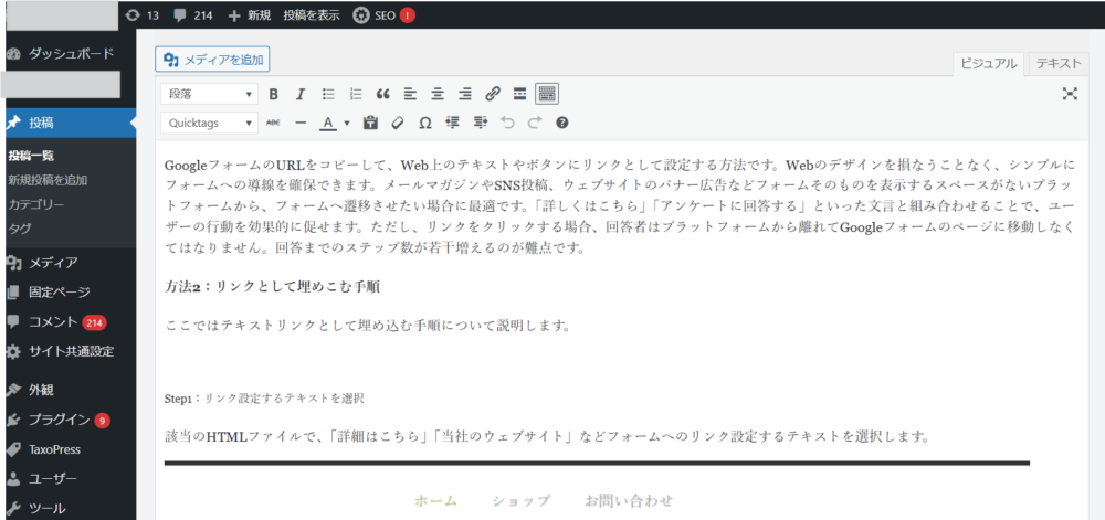 WordPressの管理画面で、フォームを設置したい投稿または固定ページを開いて編集モードに入ります。