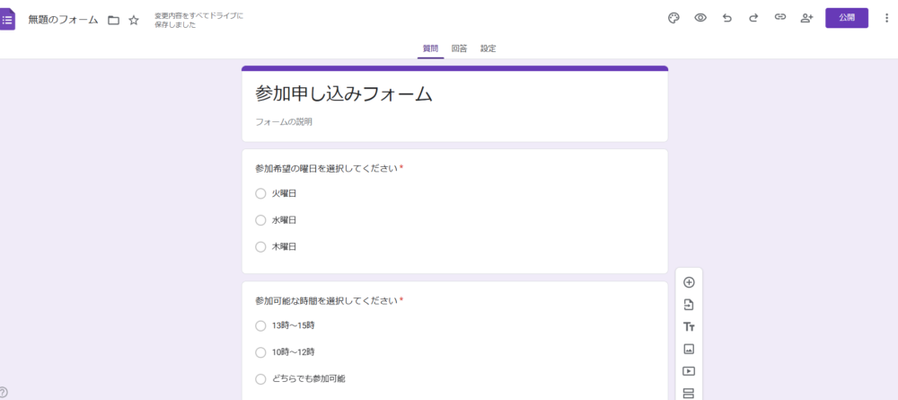 新規フォームを作成するか、既存のフォームを開きます。必要な質問項目を追加し、各種設定を行ってフォームを完成させましょう。