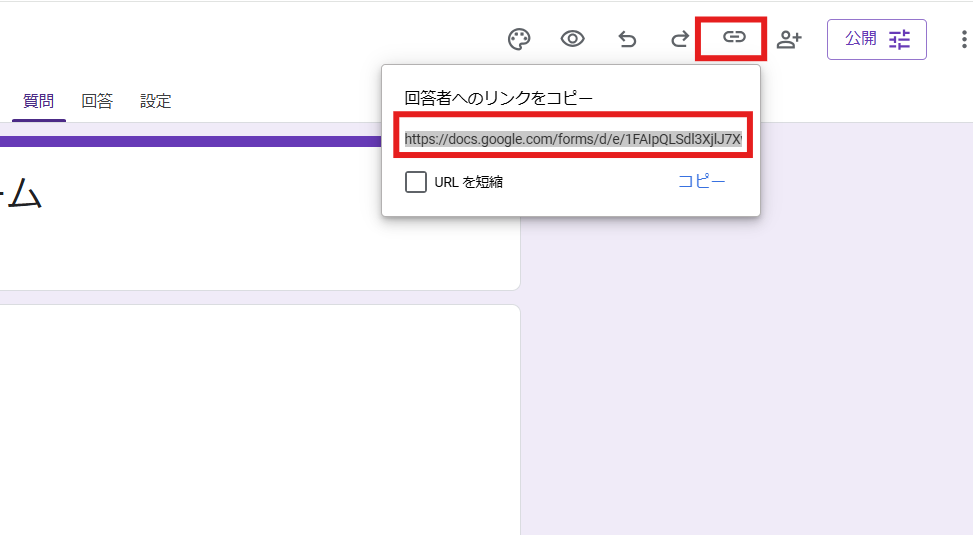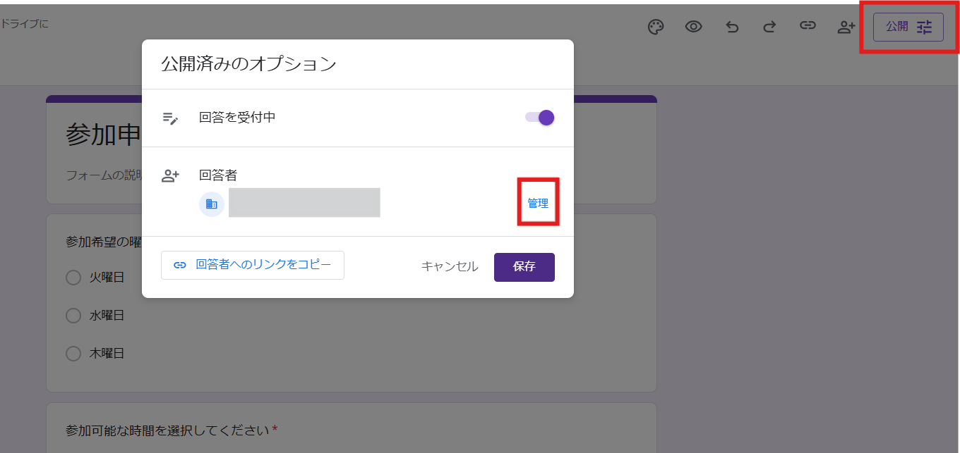 フォーム編集画面の右上にある「公開」をクリックすると、オプション画面が開きます。その画面の回答者の欄に表示されている「管理」をクリックして「フォームの共有」画面を開きます。