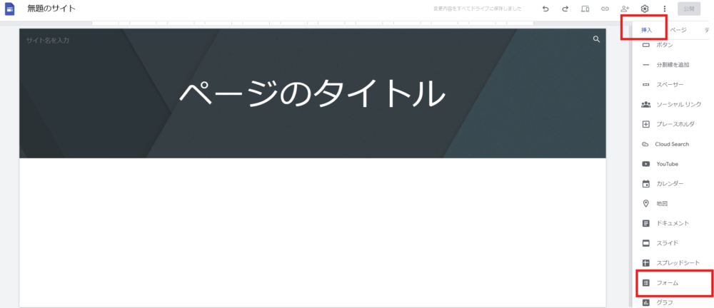 画面右側の「挿入」メニューから「フォーム」を選択します。表示されるリストから目的のフォームを選び、「挿入」をクリックすれば完了です。これでサイト上にフォームが表示されます。
