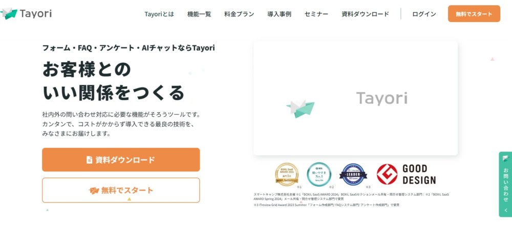株式会社PR TIMESの運営する「Tayori」は、「フォーム」「FAQ」「AIチャットボット」「アンケート」「有人チャット」のカスタマーサポートに必要な5つの機能を備えたツールです。直感的に操作可能なUIで、社内外の問い合わせ対応に活用できます。誰でも気軽に問い合わせ管理がスタートできるように、無料プランや有料プランの無料トライアルも用意しています。