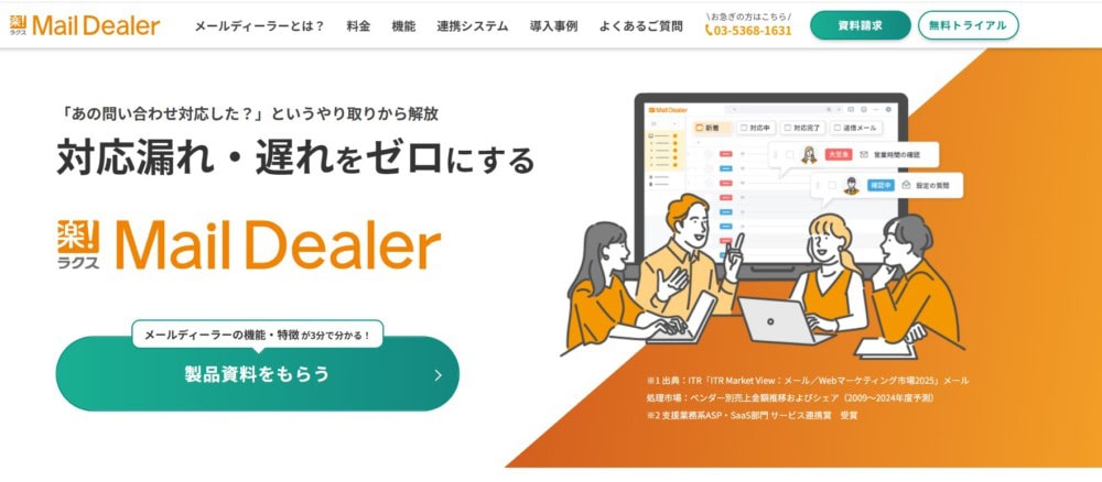 株式会社ラクスが提供するMail Dealerはステータスがタブ別に整理でき、対応状況を一目で確認できます。メールだけではなく、電話やチャットmLINE公式アカウントなど多数のチャネルを一元管理可能です。月額料金は、ユーザー数や保存通数に応じて変動します。