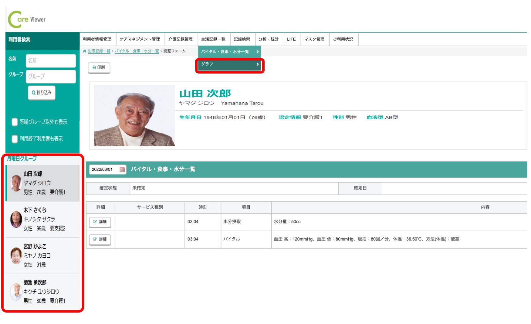 左側のリストから対象の利用者を選択し、生活記録一覧から「グラフ」を