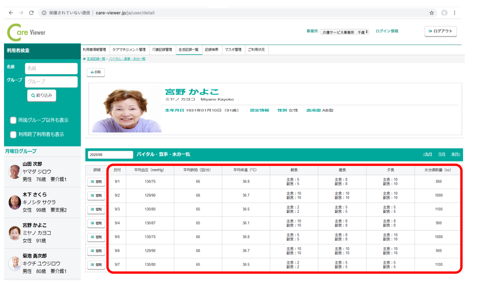 左側のリストから対象の利用者を選択し、生活記録一覧から「バイタル・食事・水分一覧」を押してください。
