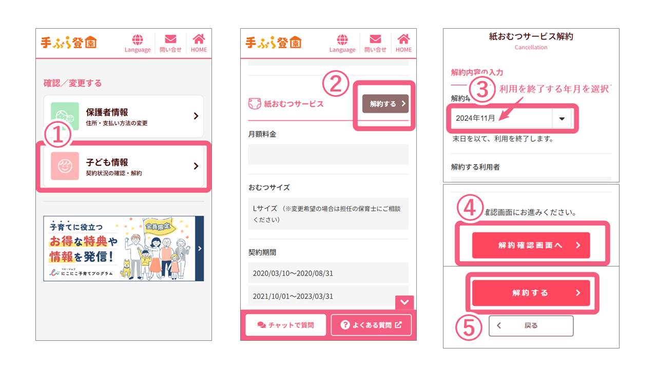 マイページにログイン後、 「子ども情報」→「紙おむつサービス」の右側「解約する」から現在の保育施設でのサービスを解約してください。
