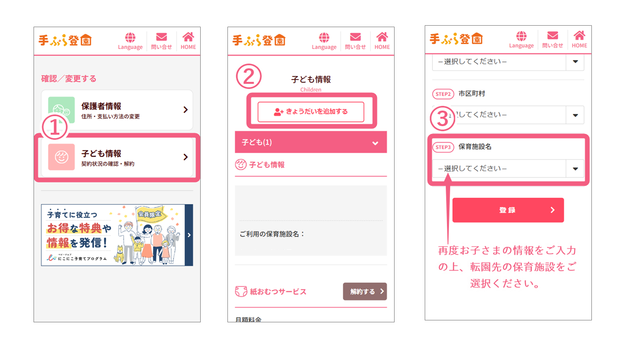 マイページから以下の2ステップで、簡単に転園先の保育施設でもサービスを継続してご利用いただけます。