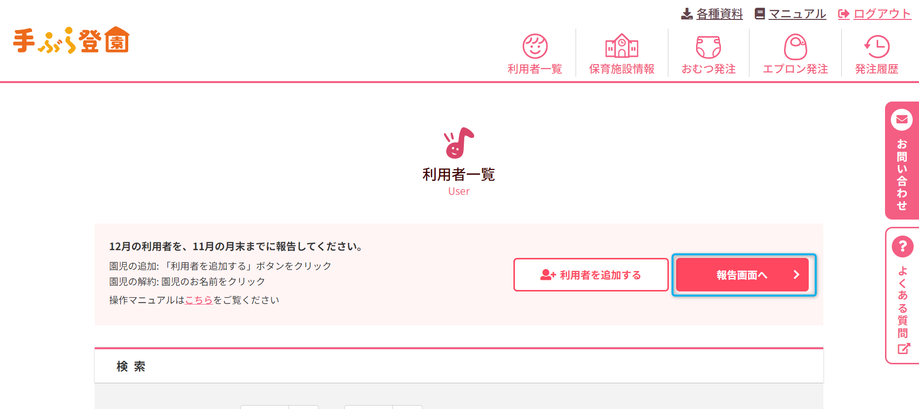 ⑤再度、「利用者一覧」ページ「報告する」をクリックして、利用者報告を行う。