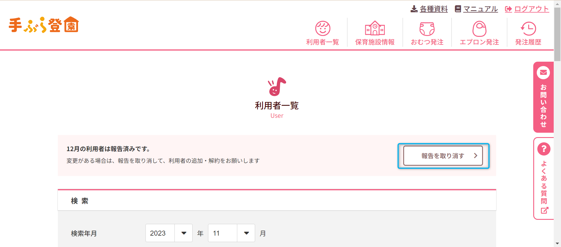 ③「●月の利用者は報告済みです。」の文言の右側にある「報告を取り消す」をクリック