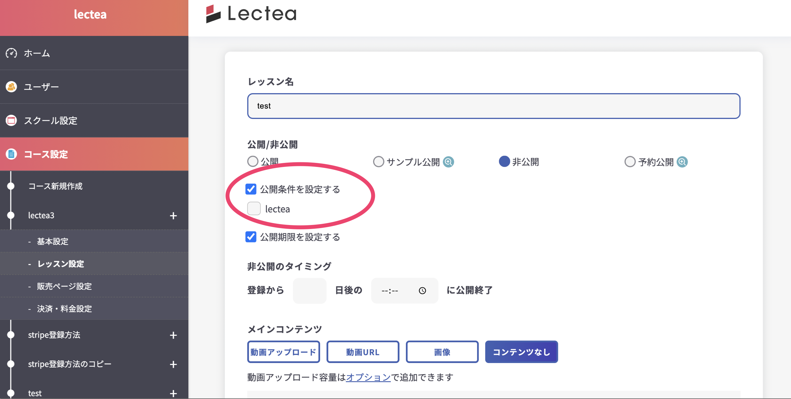 該当コースの「レッスン設定」の編集画面にて、設定できます。
