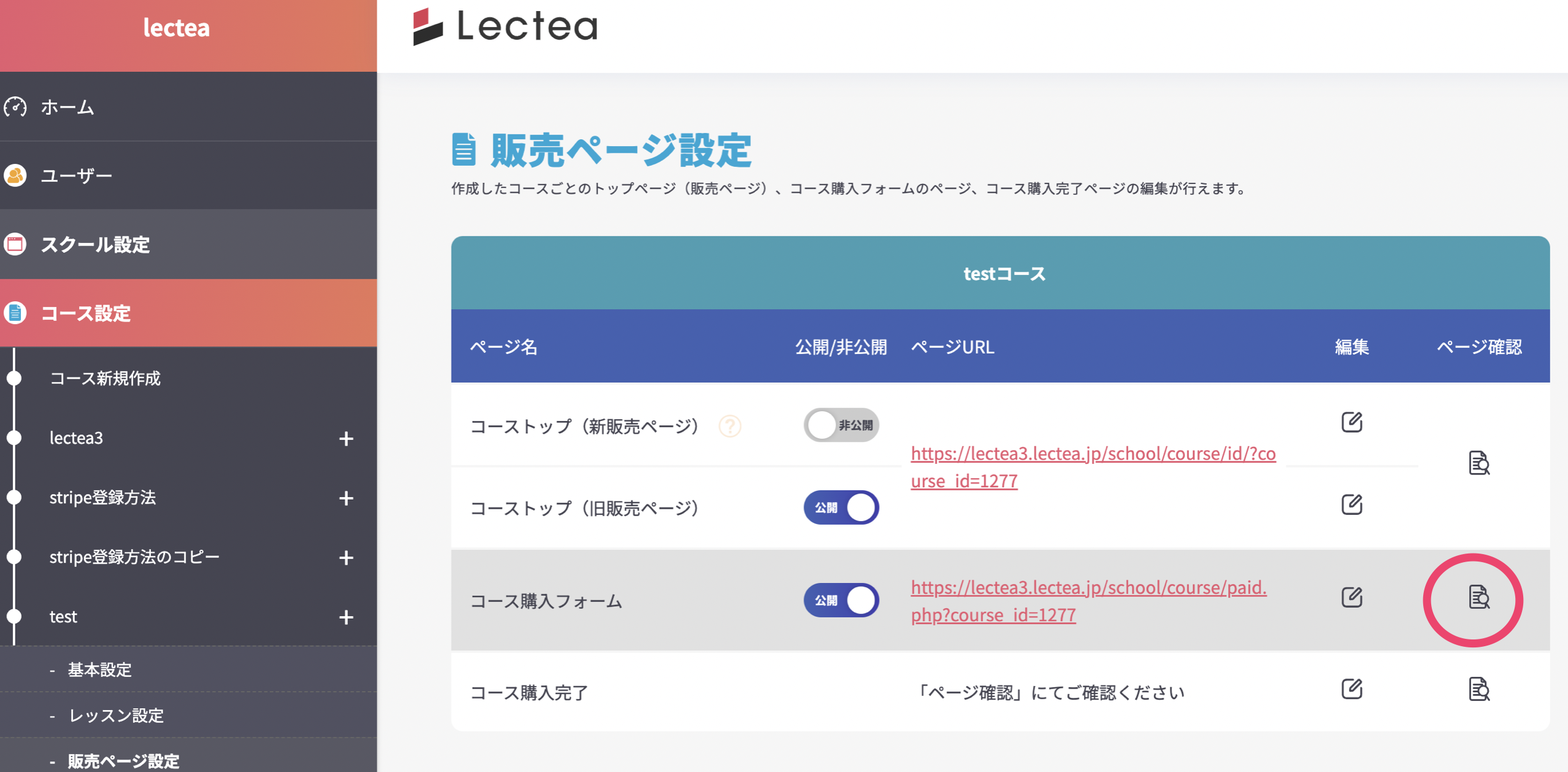 販売ページ設定をクリックし、コース購入フォームの「ページ確認」をクリックします。