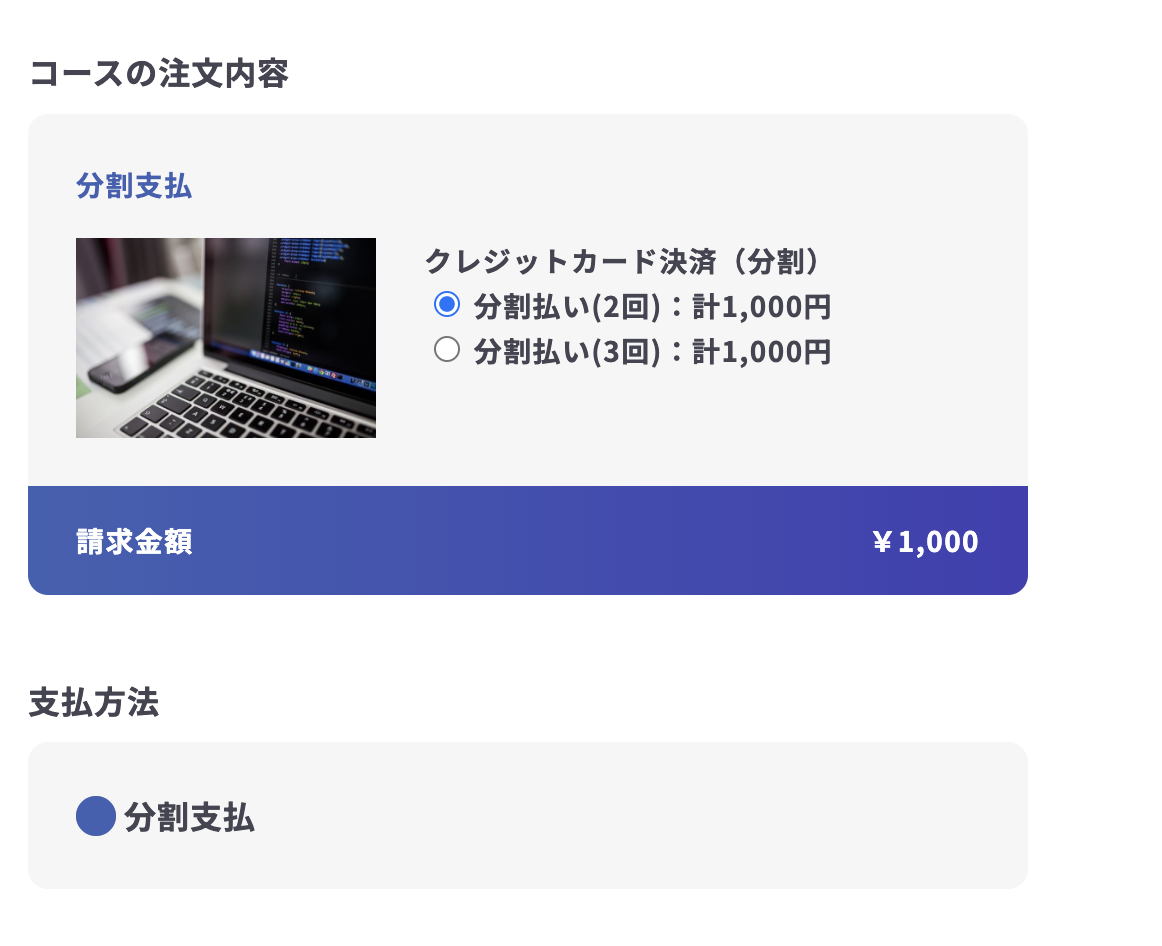 「クレジットカード決済(一括)」をクリックして「クレジットカード(分割)」を選択します。