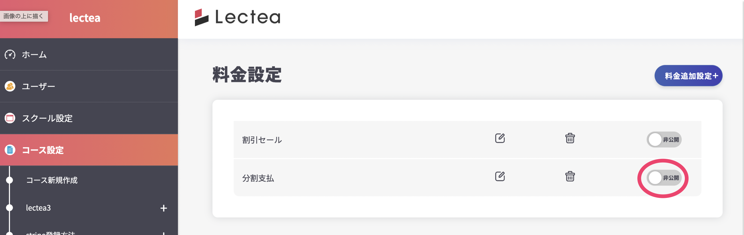 確認するには、まず、料金設定したページを公開します。「公開/非公開」のボタンが「非公開」になっているので、クリックし、「公開」に設定します。