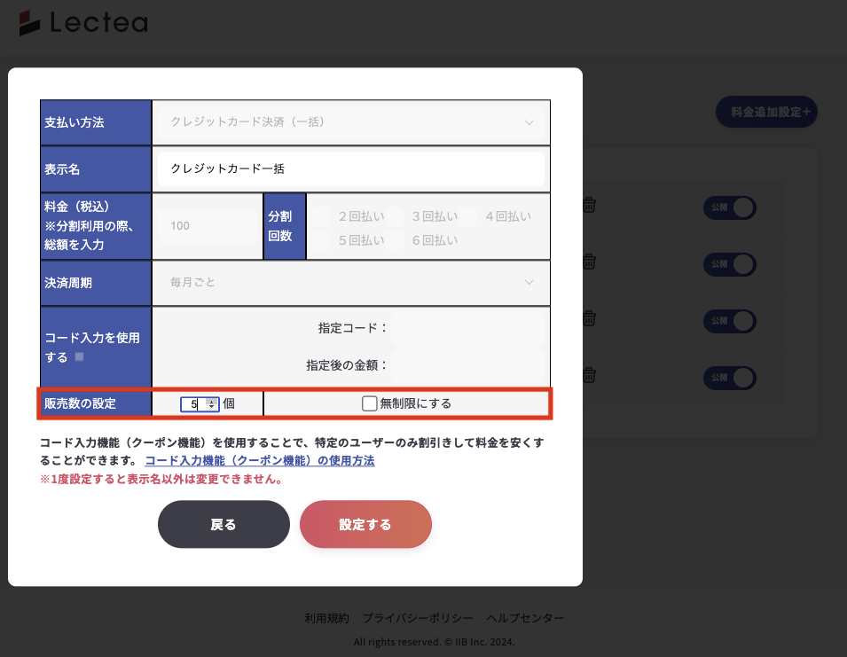 はい。可能です。設定した料金ごとに販売数の設定が可能で、限定数をもうけた販売が可能になります。