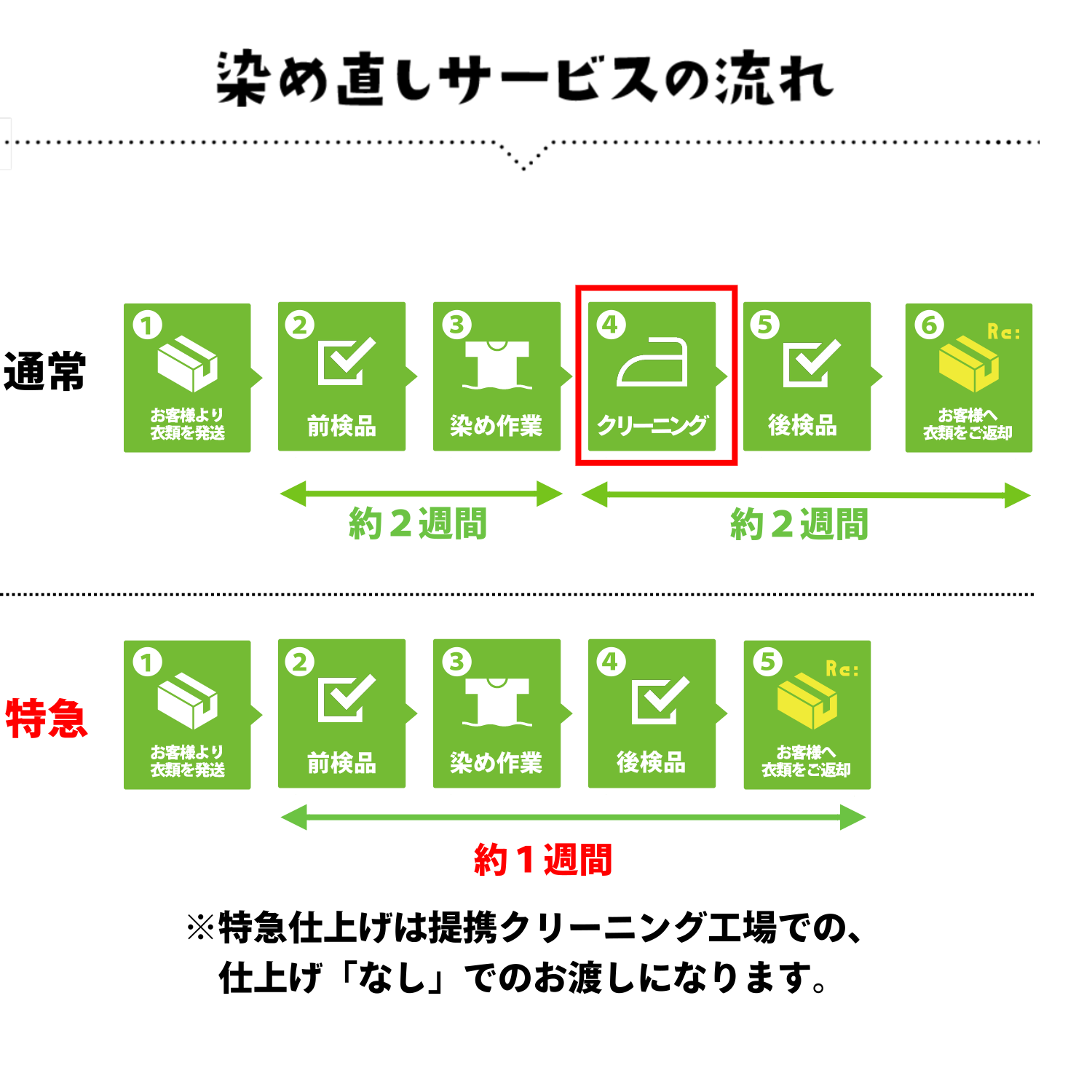 染め直しの通常と特急の場合の流れの違いは下記のようになります。