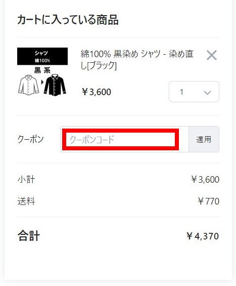 購入者情報の入力欄にある「クーポン > クーポンコード」に、指定のコードを入力してください。