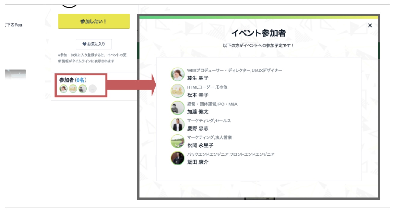 登録したイベントの参加表明したユーザーは、イベント詳細から確認できます。参加者の人数をクリックすると、参加表明した全てのユーザーが表示されます。
