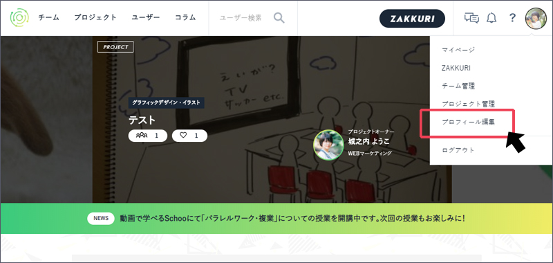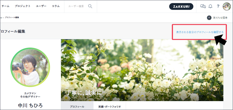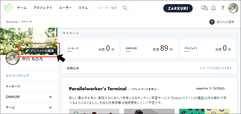 画面上部にあるアイコンをクリックし、【ボタン:プロフィール編集】より、プロフィールを編集します。