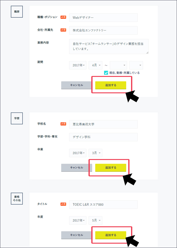 職歴、学歴、資格・その他を入力することができます。複数追加することも可能です。