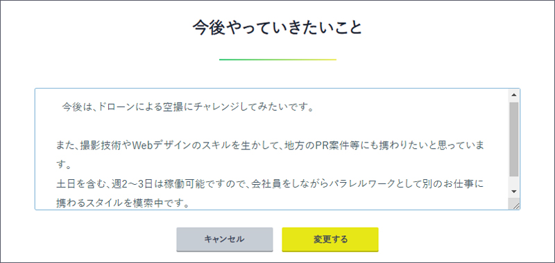 【ボタン:変更する】より、「今後やっていきたいこと」を入力することができます。