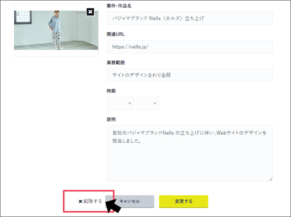 追加した実績・ポートフォリオは、【ボタン:変更する】>【ボタン:削除する】より削除することができます。