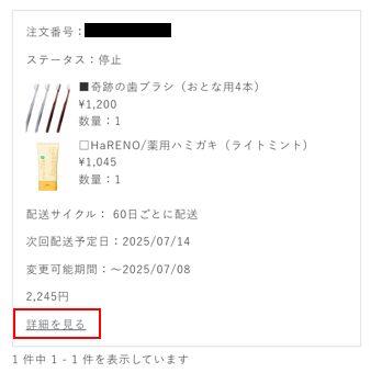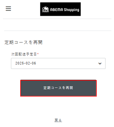 定期コースの再開方法 1.マイページの定期コースから、再開したい定期の「詳細を見る」を選択します。 ▼定期コース https://ssr.abemashopping.jp/shop/customer/subs_orders 2.ページ下部の「定期コースを再開」を選択します。 以上です!