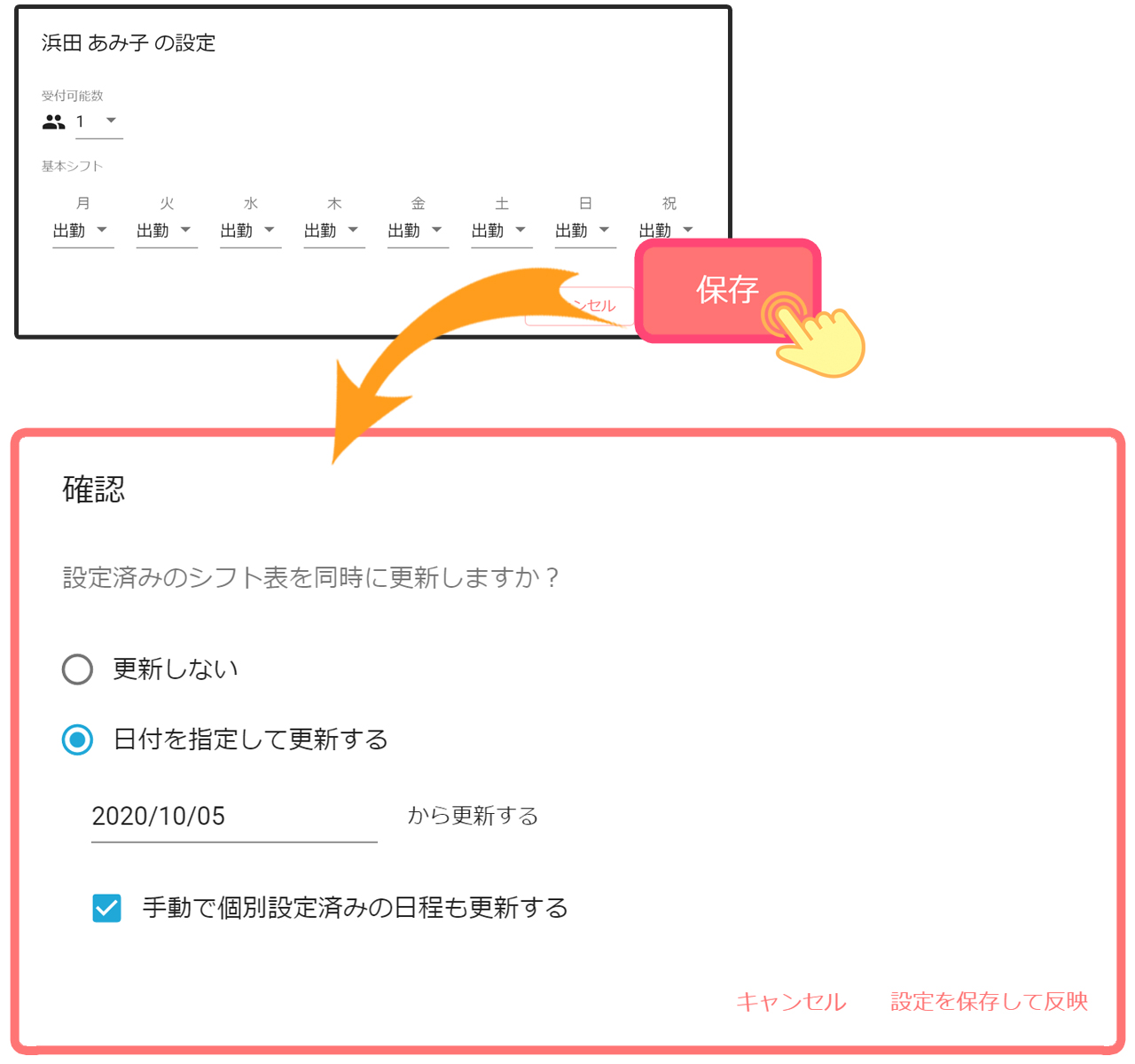 スタッフの設定編集が完了したら「保存」を選択します。変更内容が保存される前に確認画面が表示され、シフト表の更新範囲を指定できます。