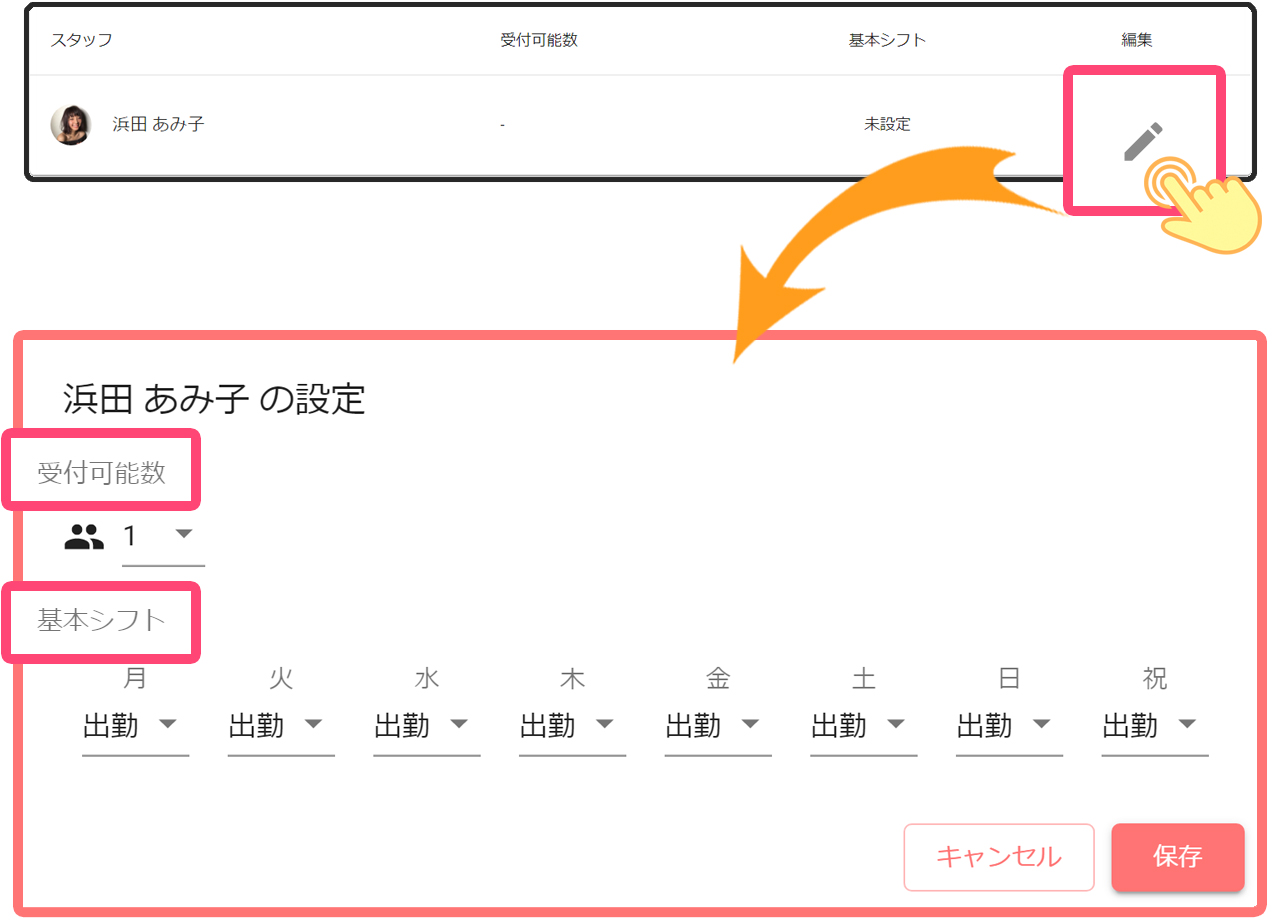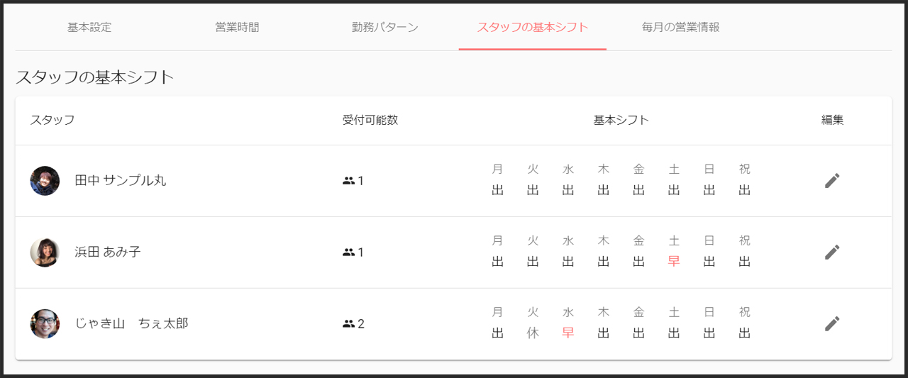 各スタッフの行で「編集アイコン」を選択することで、そのスタッフに関する設定変更が行えます。設定可能な項目は、そのスタッフの受付可能数及び曜日毎の勤務パターンです。