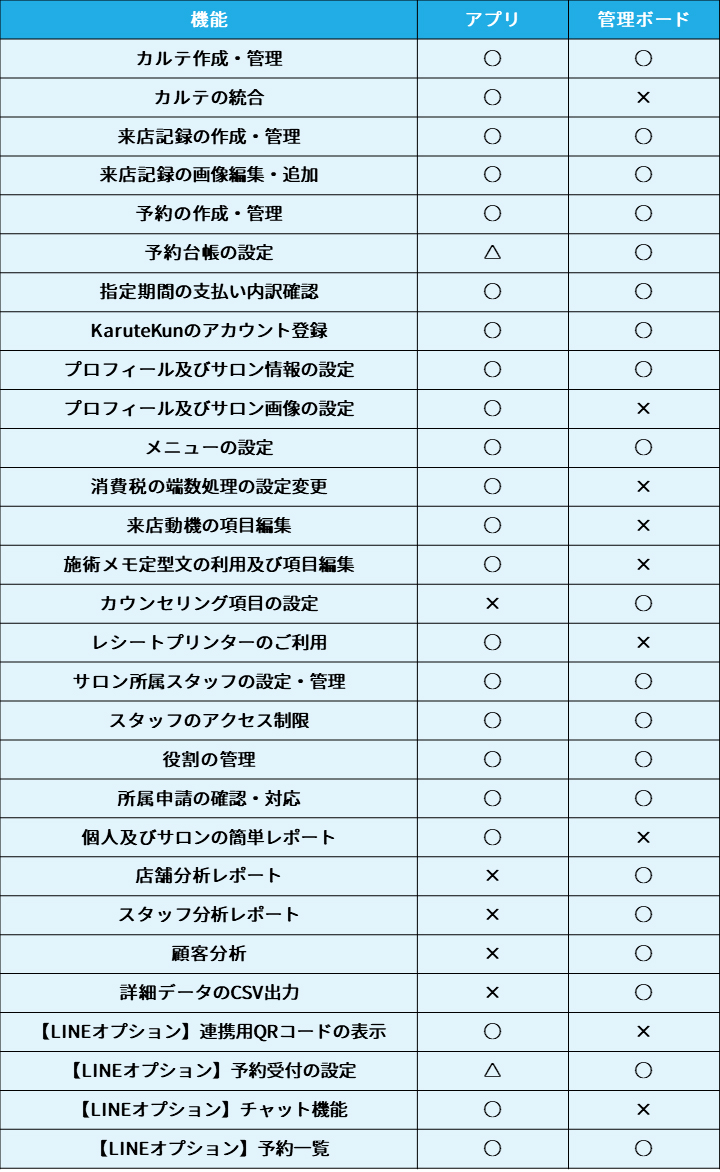 KaruteKunアプリと管理ボードの機能比較 KaruteKunの機能や設定には、KaruteKunアプリのみでご利用いただけるものと、KaruteKun管理ボードのみでご利用いただけるものがあります。 # アプリ # 来店記録 # カルテ # 予約台帳