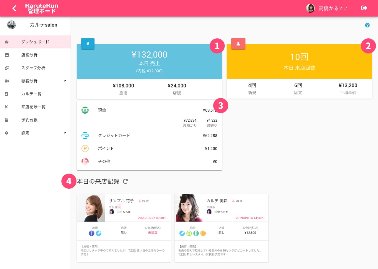 2.本日の来店客情報:来店されたお客様の人数や新規/固定の内訳、お客様の支払い単価が表示されます。