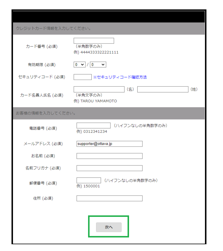 クレジットカード情報、お客様の情報を入力 [次へ]