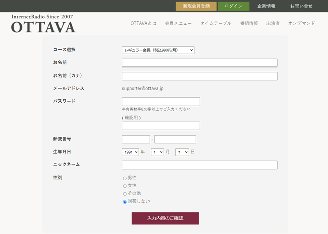 入力されたアドレスにメール 件名【OTTAVA】会員登録のご案内 が届きます